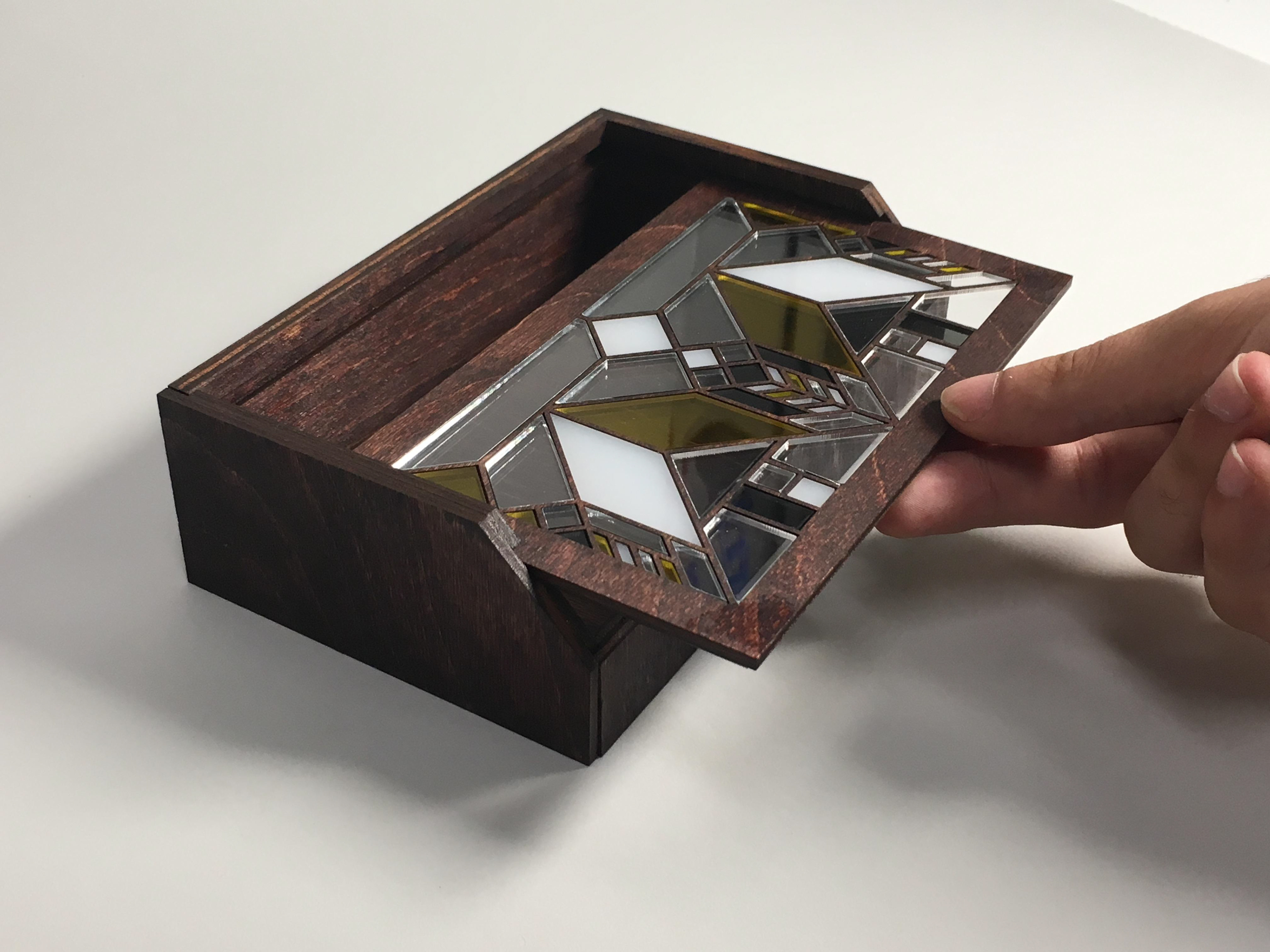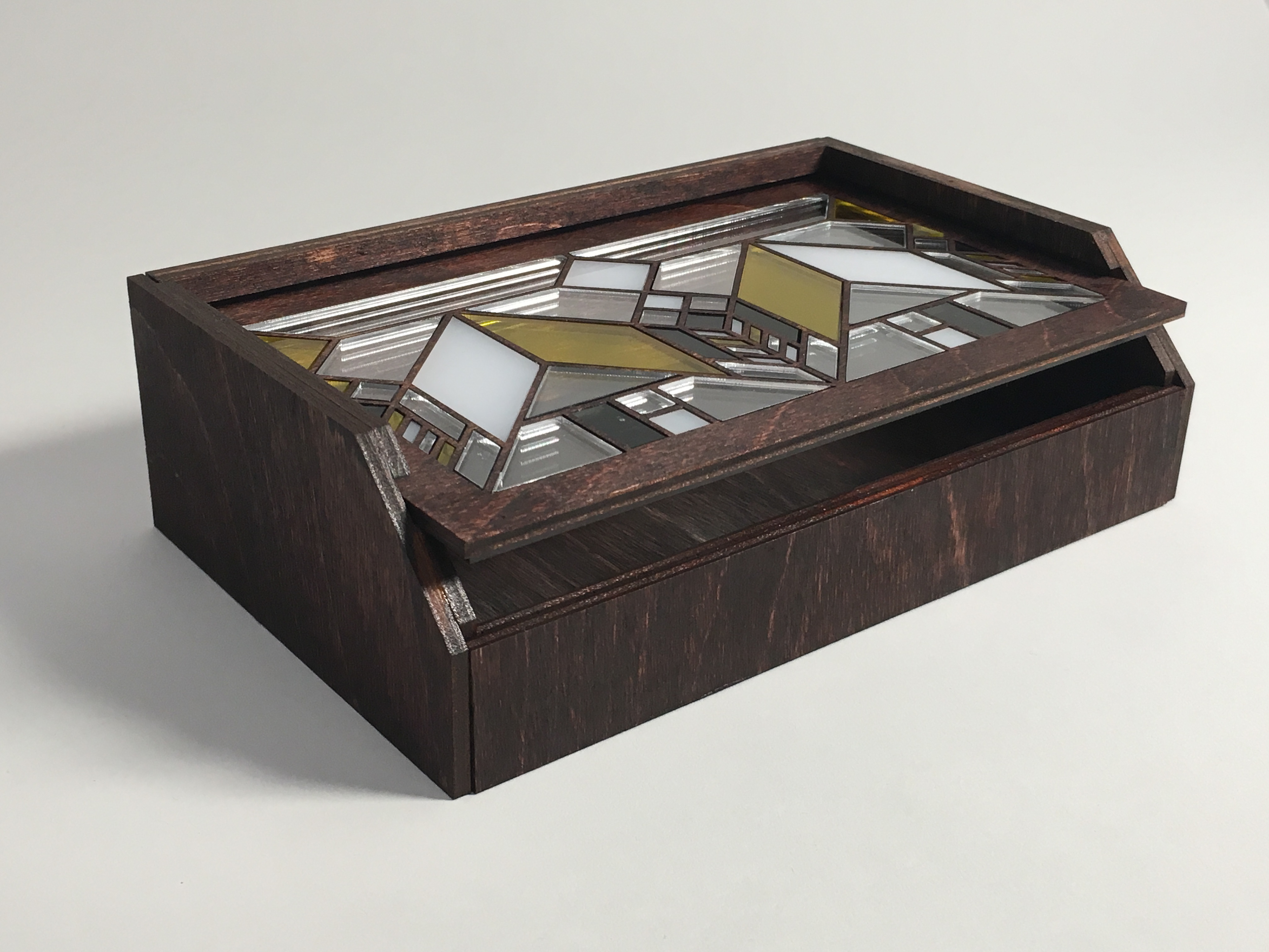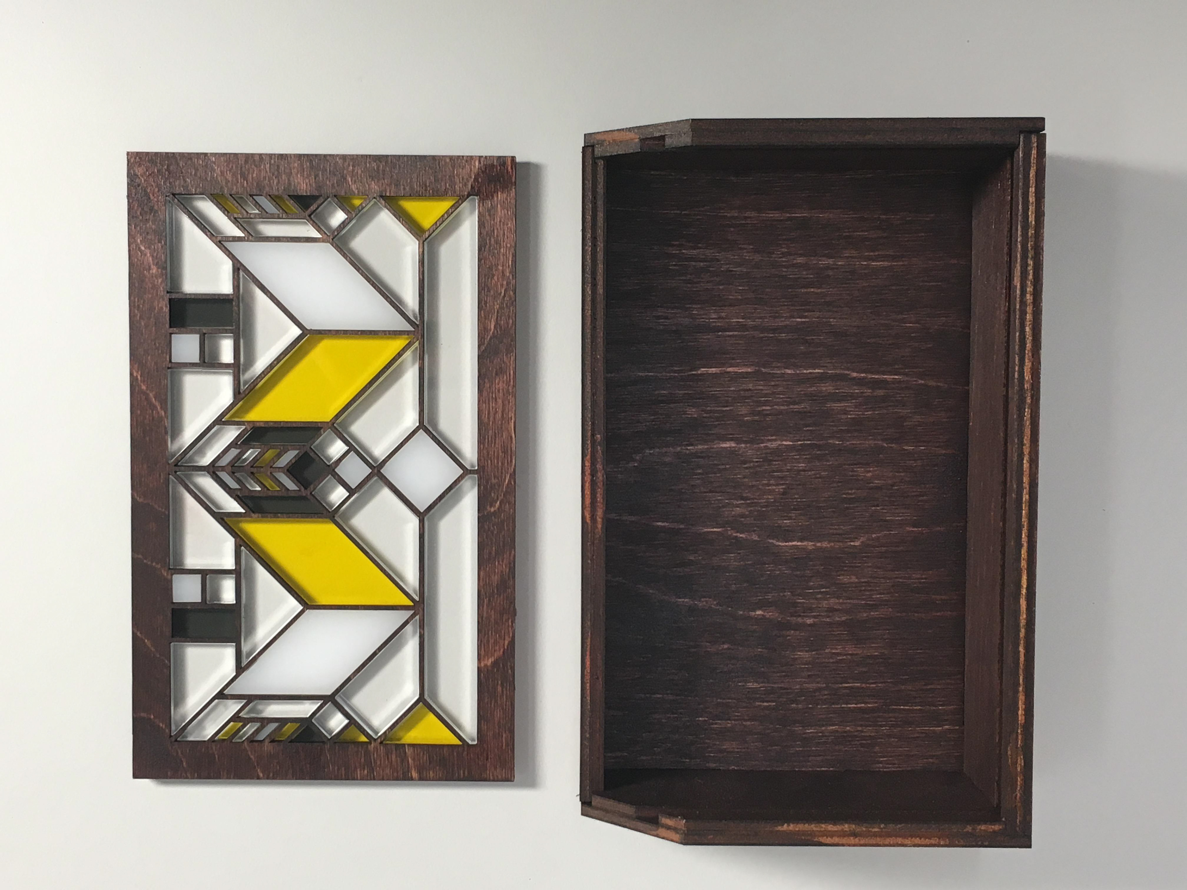Lasercut pencilbox inspired by Frank Lloyd Wright's leaded windows. Plywood, acrylic.