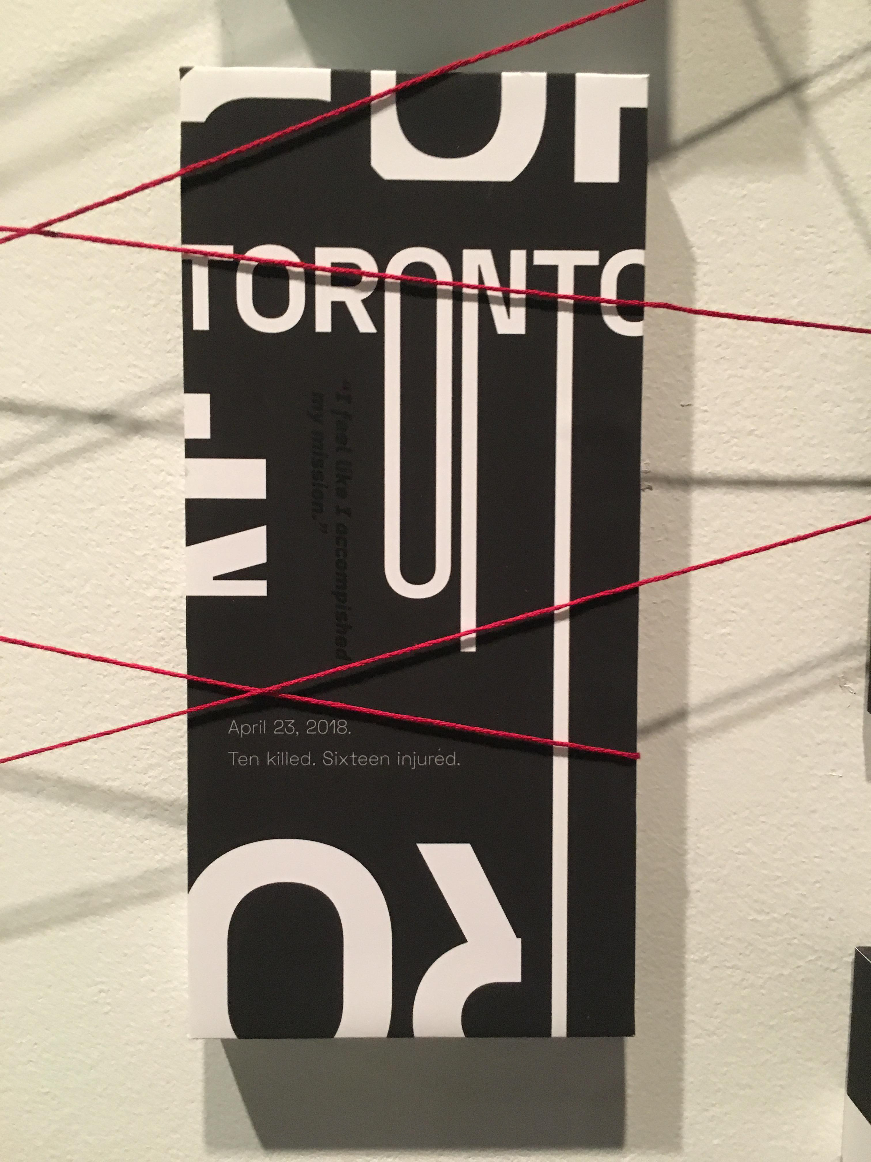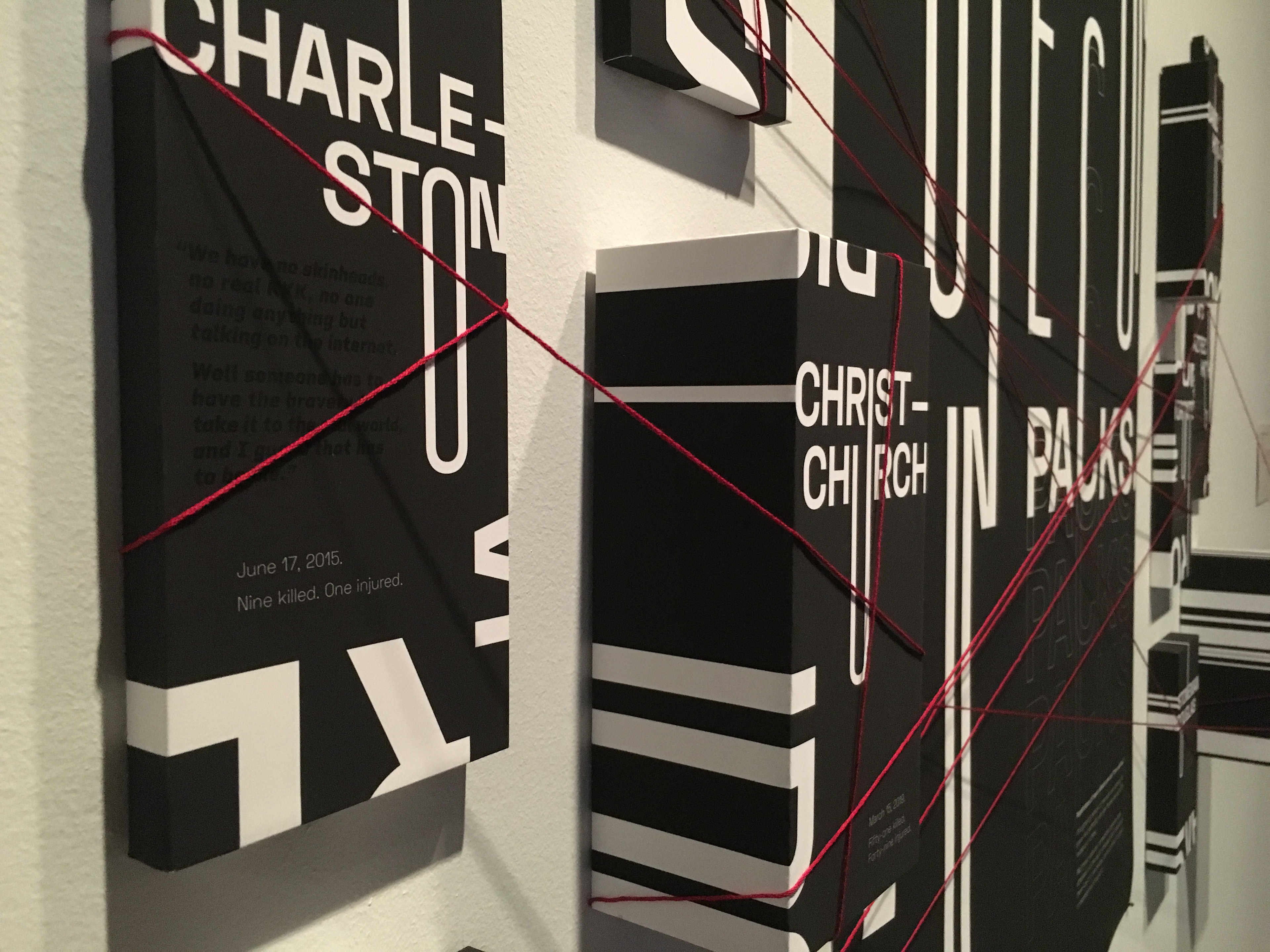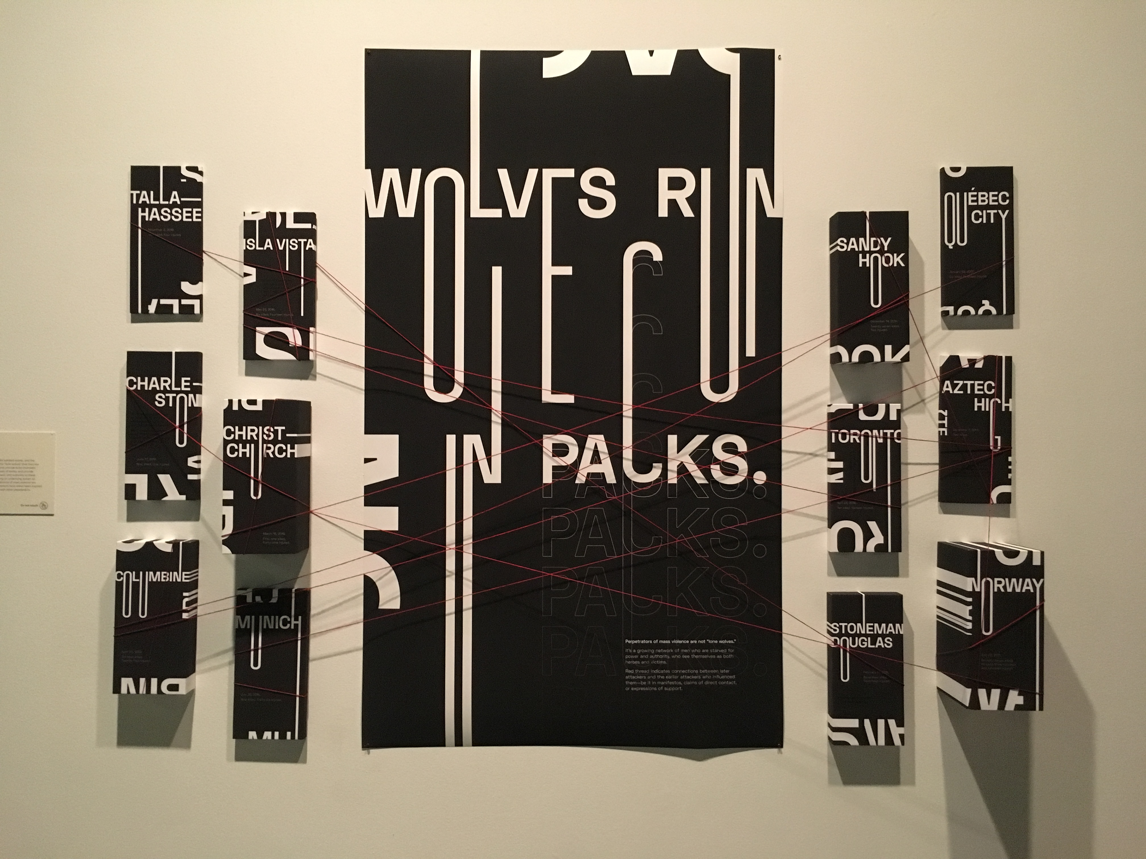 The final deliverable took form as a wall installation showing the connections and influences of past attacks on more recent ones. Red thread indicates those influences, box depth represents the death count of each instance, and some boxes have quotes from perpetrators in black type to communicate how they see themselves as heroes, martyrs, and victims.